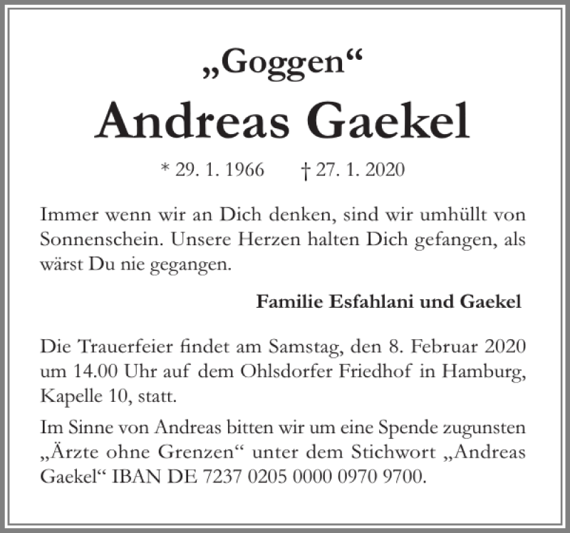 Hier finden Sie alle Traueranzeigen aus der Zeitung, die bisher für Andreas Gaekel erschienen sind. Weitere Traueranzeigen, die in der Zeitung erscheinen, werden hier ebenfalls aufgelistet