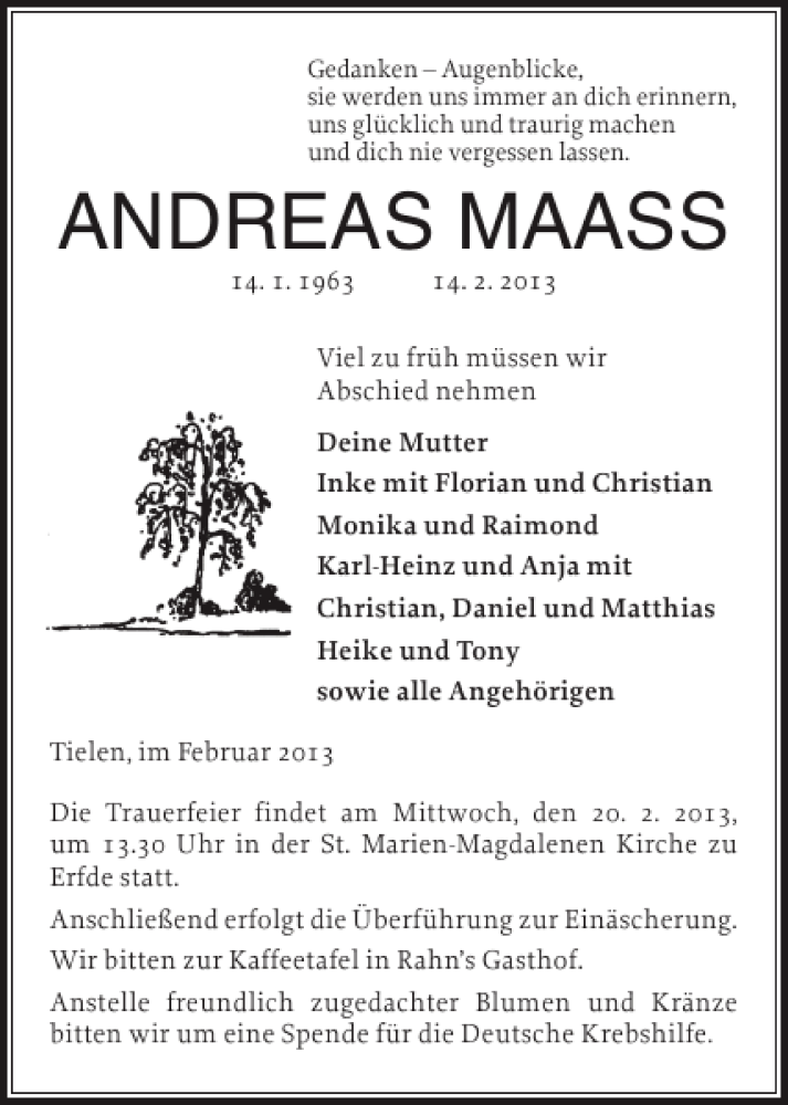 Hier finden Sie alle Traueranzeigen aus der Zeitung, die bisher für ANDREAS MAASS erschienen sind. Weitere Traueranzeigen, die in der Zeitung erscheinen, werden hier ebenfalls aufgelistet
