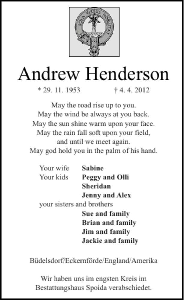 Hier finden Sie alle Traueranzeigen aus der Zeitung, die bisher für Andrew Henderson erschienen sind. Weitere Traueranzeigen, die in der Zeitung erscheinen, werden hier ebenfalls aufgelistet