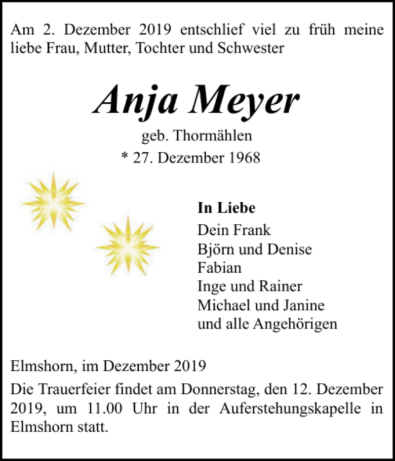 Hier finden Sie alle Traueranzeigen aus der Zeitung, die bisher für Anja Meyer erschienen sind. Weitere Traueranzeigen, die in der Zeitung erscheinen, werden hier ebenfalls aufgelistet