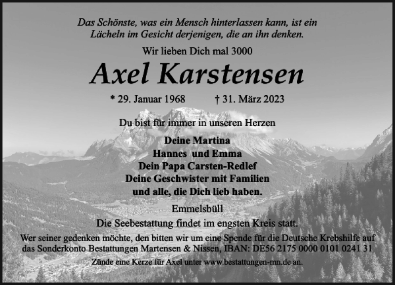 Hier finden Sie alle Traueranzeigen aus der Zeitung, die bisher für Axel Karstensen erschienen sind. Weitere Traueranzeigen, die in der Zeitung erscheinen, werden hier ebenfalls aufgelistet