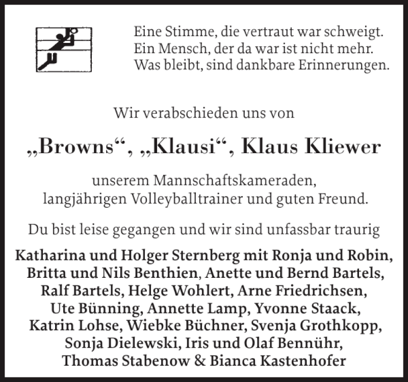 Hier finden Sie alle Traueranzeigen aus der Zeitung, die bisher für Browns Klausi Klaus Kliewer erschienen sind. Weitere Traueranzeigen, die in der Zeitung erscheinen, werden hier ebenfalls aufgelistet