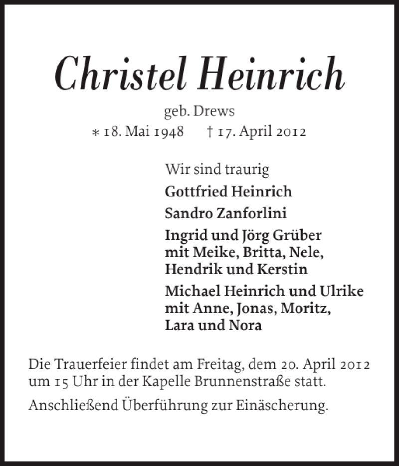 Hier finden Sie alle Traueranzeigen aus der Zeitung, die bisher für Christel Heinrich erschienen sind. Weitere Traueranzeigen, die in der Zeitung erscheinen, werden hier ebenfalls aufgelistet