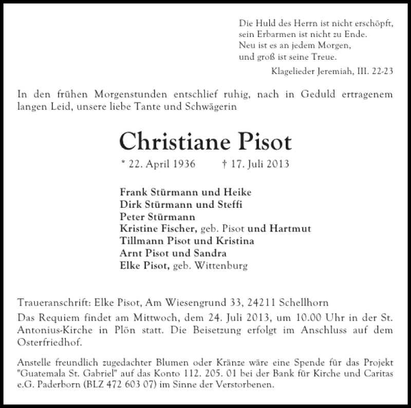 Hier finden Sie alle Traueranzeigen aus der Zeitung, die bisher für Christiane Pisot erschienen sind. Weitere Traueranzeigen, die in der Zeitung erscheinen, werden hier ebenfalls aufgelistet