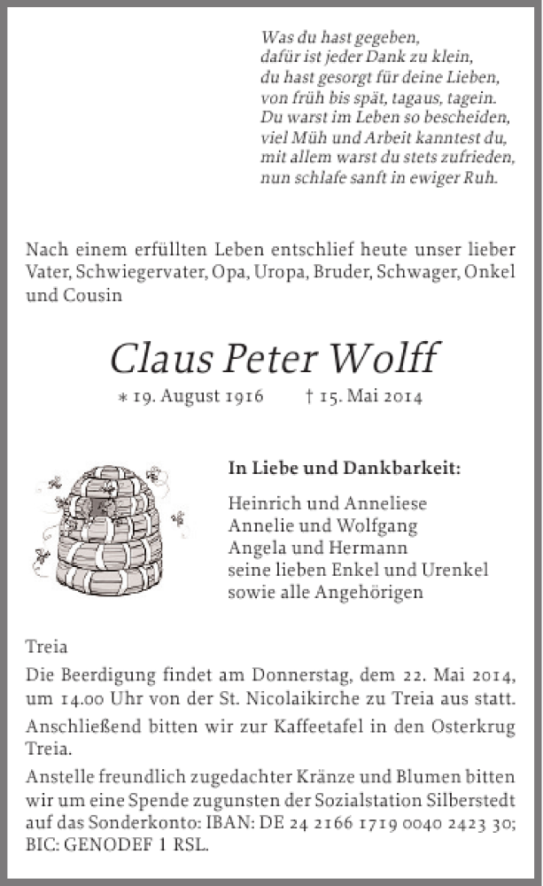 Hier finden Sie alle Traueranzeigen aus der Zeitung, die bisher für Claus Peter Wolff erschienen sind. Weitere Traueranzeigen, die in der Zeitung erscheinen, werden hier ebenfalls aufgelistet