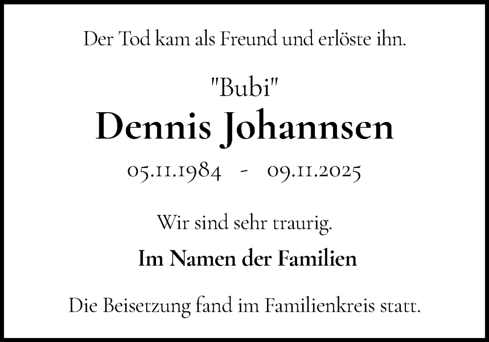 Hier finden Sie alle Traueranzeigen aus der Zeitung, die bisher für Dennis Johannsen erschienen sind. Weitere Traueranzeigen, die in der Zeitung erscheinen, werden hier ebenfalls aufgelistet