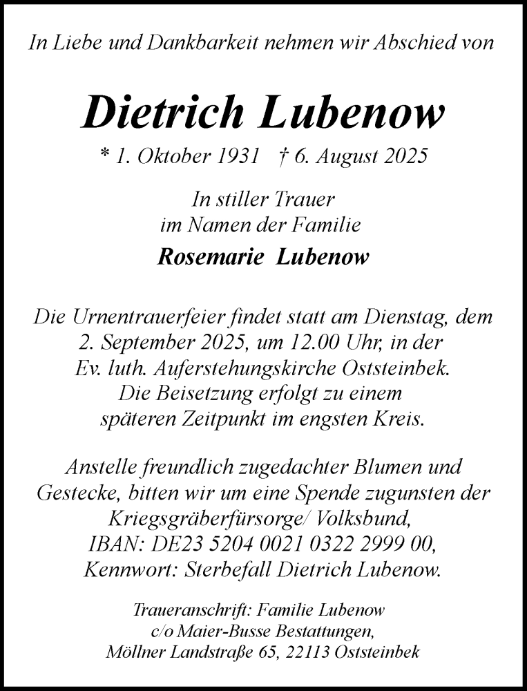 Hier finden Sie alle Traueranzeigen aus der Zeitung, die bisher für Dietrich Lubenow erschienen sind. Weitere Traueranzeigen, die in der Zeitung erscheinen, werden hier ebenfalls aufgelistet