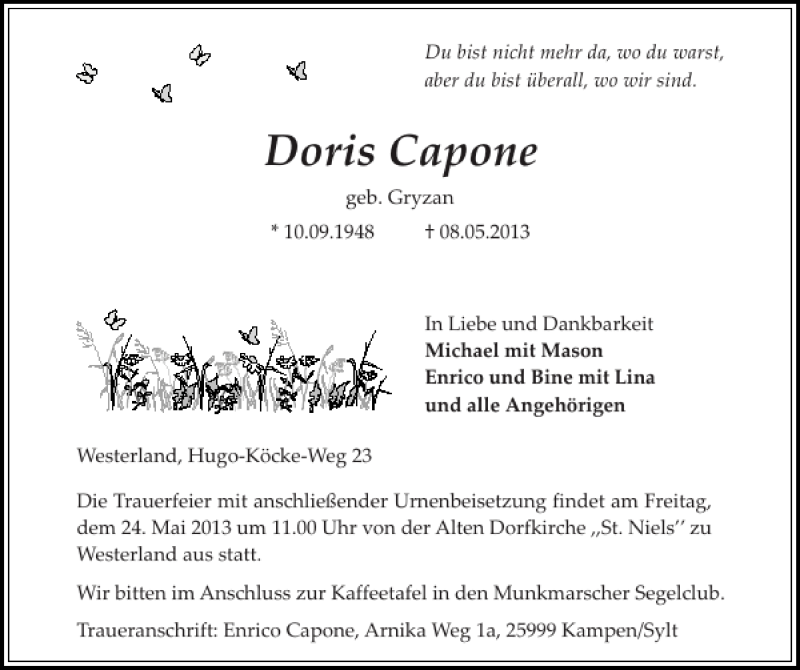 Hier finden Sie alle Traueranzeigen aus der Zeitung, die bisher für Doris Capone erschienen sind. Weitere Traueranzeigen, die in der Zeitung erscheinen, werden hier ebenfalls aufgelistet