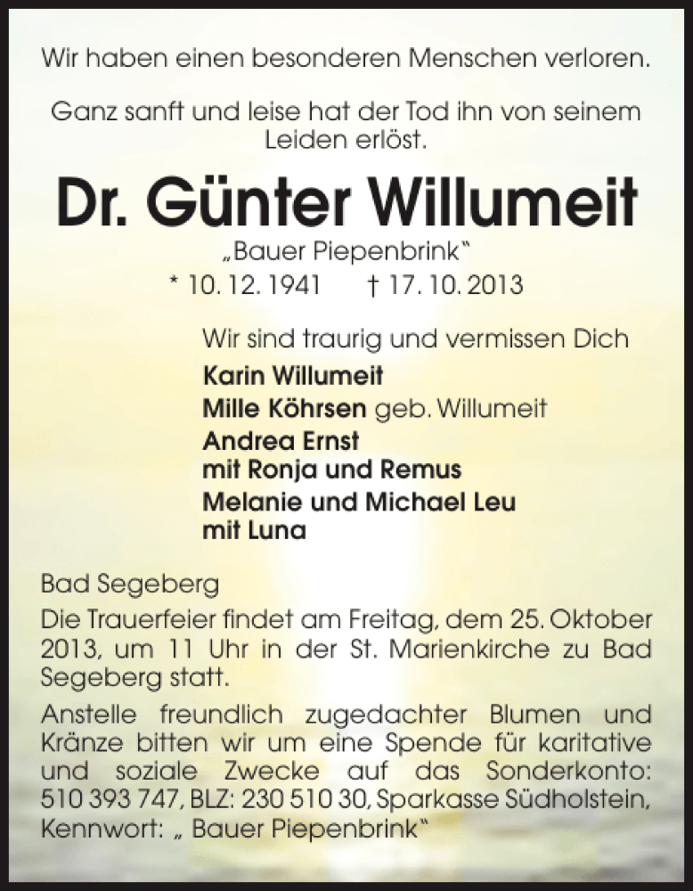 Hier finden Sie alle Traueranzeigen aus der Zeitung, die bisher für Dr. Günter Willumeit erschienen sind. Weitere Traueranzeigen, die in der Zeitung erscheinen, werden hier ebenfalls aufgelistet