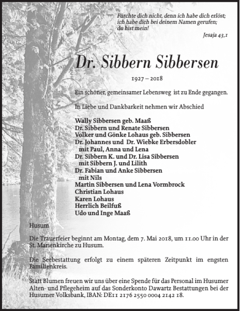 Hier finden Sie alle Traueranzeigen aus der Zeitung, die bisher für Dr. Sibbern Sibbersen erschienen sind. Weitere Traueranzeigen, die in der Zeitung erscheinen, werden hier ebenfalls aufgelistet