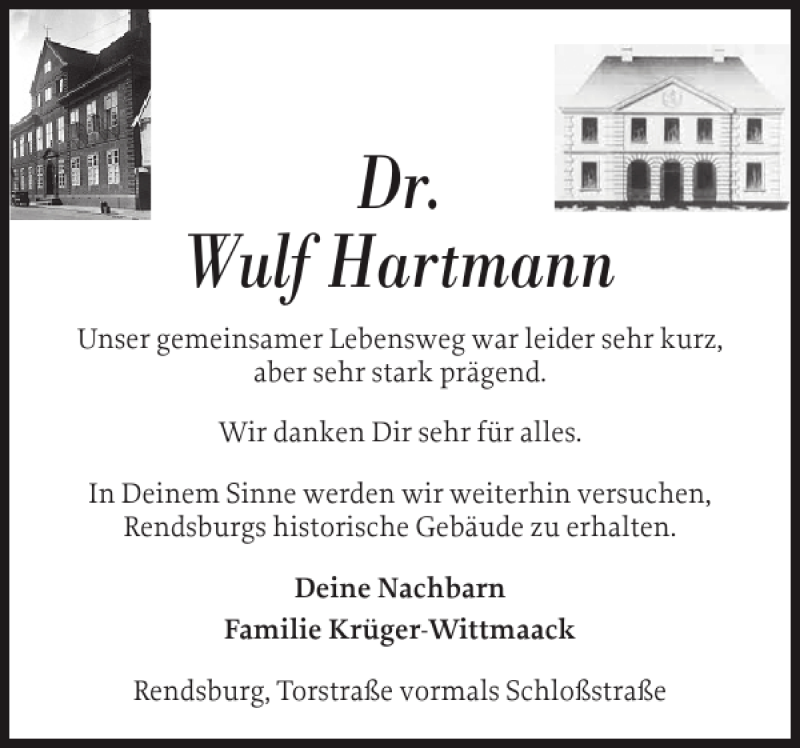 Hier finden Sie alle Traueranzeigen aus der Zeitung, die bisher für Dr. Wulf Hartmann erschienen sind. Weitere Traueranzeigen, die in der Zeitung erscheinen, werden hier ebenfalls aufgelistet