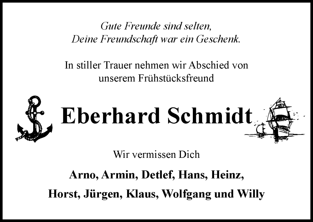 Hier finden Sie alle Traueranzeigen aus der Zeitung, die bisher für Eberhard Schmidt erschienen sind. Weitere Traueranzeigen, die in der Zeitung erscheinen, werden hier ebenfalls aufgelistet