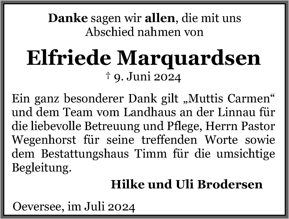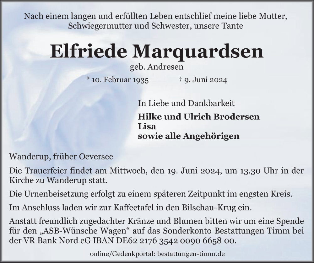 Hier finden Sie alle Traueranzeigen aus der Zeitung, die bisher für Elfriede Marquardsen erschienen sind. Weitere Traueranzeigen, die in der Zeitung erscheinen, werden hier ebenfalls aufgelistet