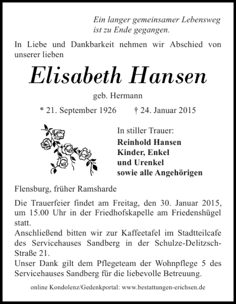Hier finden Sie alle Traueranzeigen aus der Zeitung, die bisher für Elisabeth Hansen erschienen sind. Weitere Traueranzeigen, die in der Zeitung erscheinen, werden hier ebenfalls aufgelistet