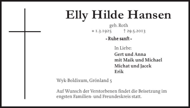 Hier finden Sie alle Traueranzeigen aus der Zeitung, die bisher für Elly Hilde Hansen erschienen sind. Weitere Traueranzeigen, die in der Zeitung erscheinen, werden hier ebenfalls aufgelistet