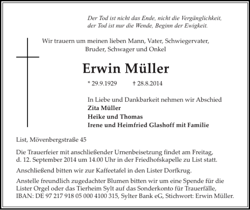 Hier finden Sie alle Traueranzeigen aus der Zeitung, die bisher für Erwin Müller erschienen sind. Weitere Traueranzeigen, die in der Zeitung erscheinen, werden hier ebenfalls aufgelistet