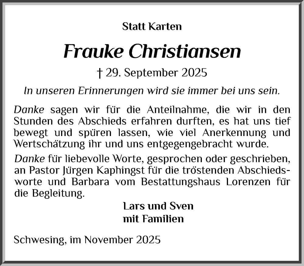 Hier finden Sie alle Traueranzeigen aus der Zeitung, die bisher für Frauke Christiansen erschienen sind. Weitere Traueranzeigen, die in der Zeitung erscheinen, werden hier ebenfalls aufgelistet