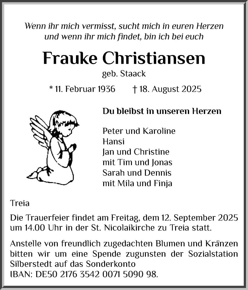 Hier finden Sie alle Traueranzeigen aus der Zeitung, die bisher für Frauke Christiansen erschienen sind. Weitere Traueranzeigen, die in der Zeitung erscheinen, werden hier ebenfalls aufgelistet