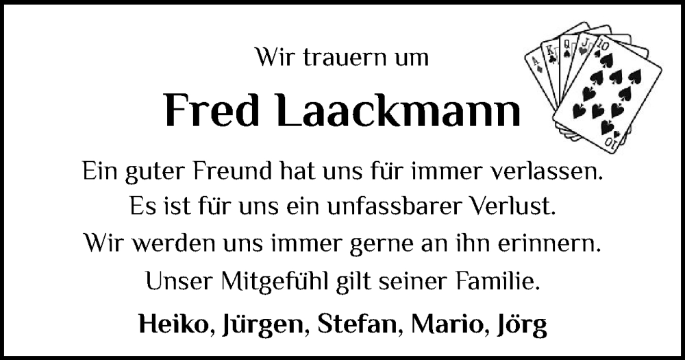 Hier finden Sie alle Traueranzeigen aus der Zeitung, die bisher für Fred Laackmann erschienen sind. Weitere Traueranzeigen, die in der Zeitung erscheinen, werden hier ebenfalls aufgelistet
