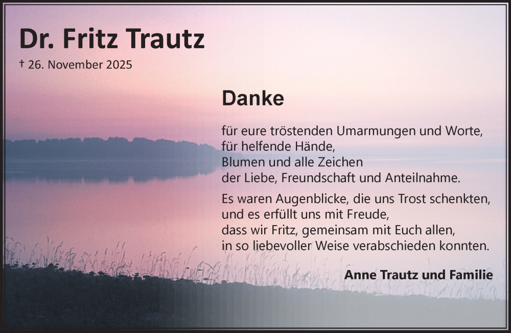 Hier finden Sie alle Traueranzeigen aus der Zeitung, die bisher für Fritz Trautz erschienen sind. Weitere Traueranzeigen, die in der Zeitung erscheinen, werden hier ebenfalls aufgelistet