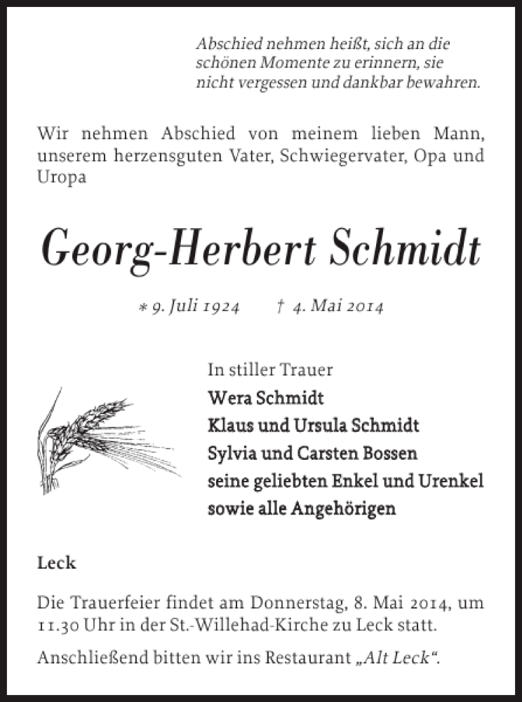 Hier finden Sie alle Traueranzeigen aus der Zeitung, die bisher für Georg-Herbert Schmidt erschienen sind. Weitere Traueranzeigen, die in der Zeitung erscheinen, werden hier ebenfalls aufgelistet