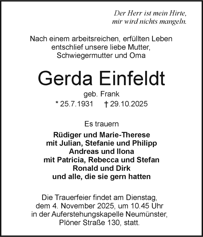 Hier finden Sie alle Traueranzeigen aus der Zeitung, die bisher für Gerda Einfeldt erschienen sind. Weitere Traueranzeigen, die in der Zeitung erscheinen, werden hier ebenfalls aufgelistet
