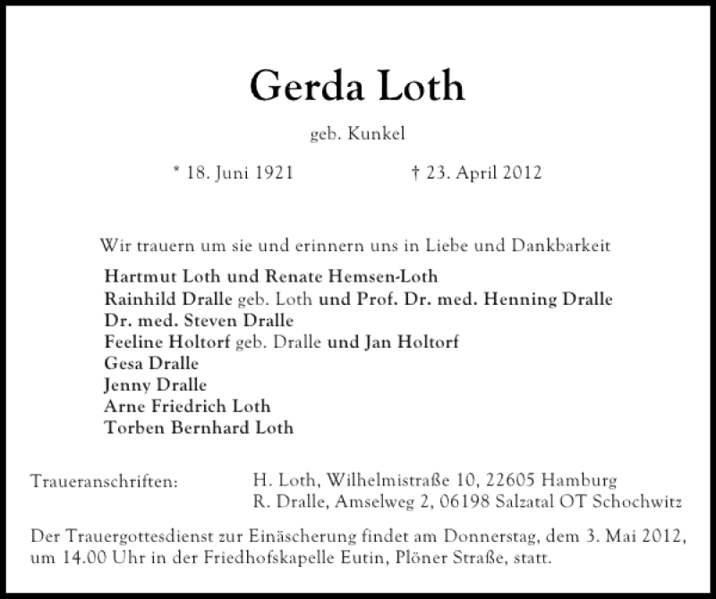 Hier finden Sie alle Traueranzeigen aus der Zeitung, die bisher für Gerda Loth erschienen sind. Weitere Traueranzeigen, die in der Zeitung erscheinen, werden hier ebenfalls aufgelistet