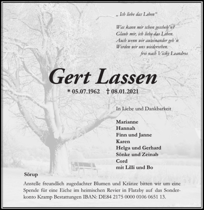 Hier finden Sie alle Traueranzeigen aus der Zeitung, die bisher für Gert Lassen erschienen sind. Weitere Traueranzeigen, die in der Zeitung erscheinen, werden hier ebenfalls aufgelistet