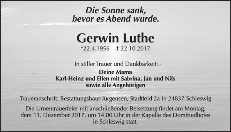 Hier finden Sie alle Traueranzeigen aus der Zeitung, die bisher für Gerwin Luthe erschienen sind. Weitere Traueranzeigen, die in der Zeitung erscheinen, werden hier ebenfalls aufgelistet