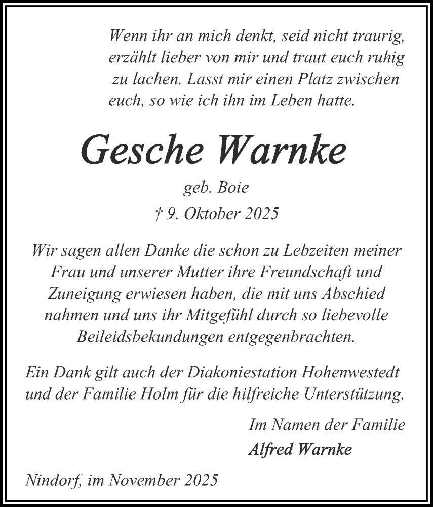 Hier finden Sie alle Traueranzeigen aus der Zeitung, die bisher für Gesche Warnke erschienen sind. Weitere Traueranzeigen, die in der Zeitung erscheinen, werden hier ebenfalls aufgelistet