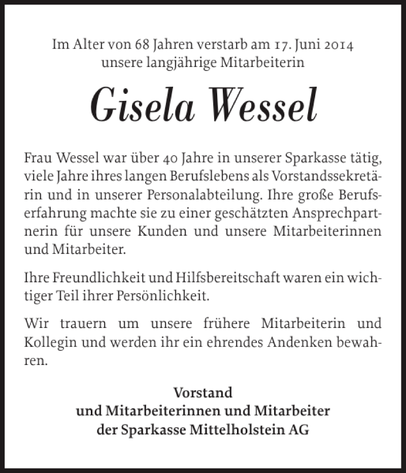 Hier finden Sie alle Traueranzeigen aus der Zeitung, die bisher für Gisela Wessel erschienen sind. Weitere Traueranzeigen, die in der Zeitung erscheinen, werden hier ebenfalls aufgelistet
