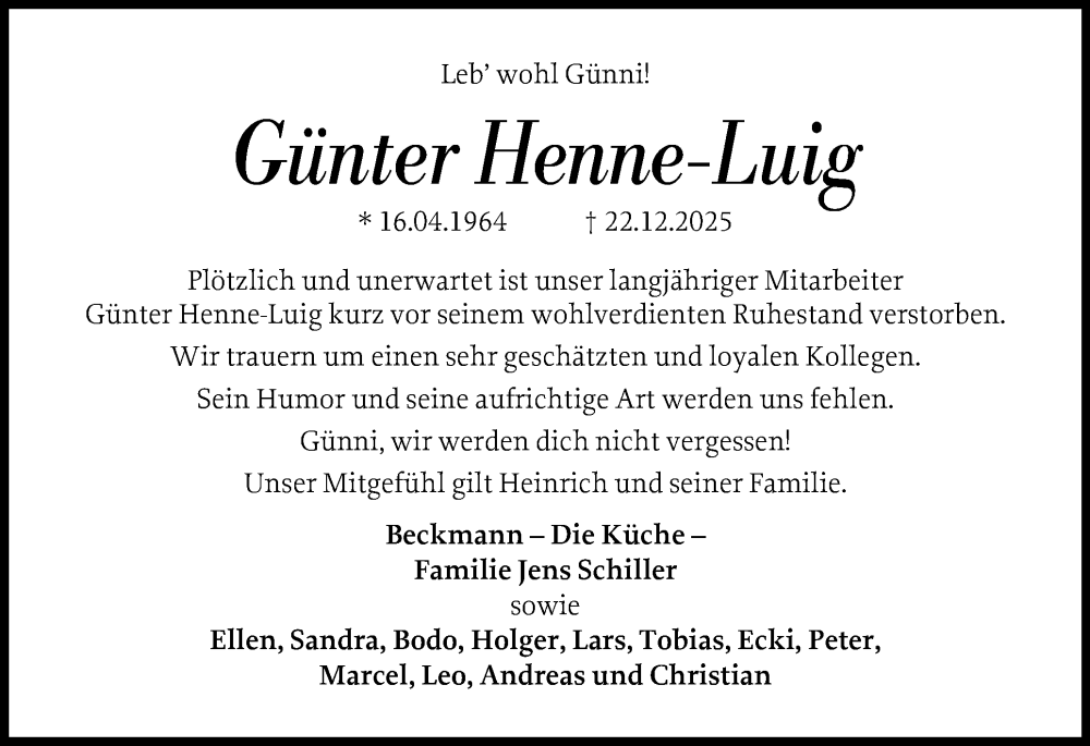 Hier finden Sie alle Traueranzeigen aus der Zeitung, die bisher für Günter Henne-Luig erschienen sind. Weitere Traueranzeigen, die in der Zeitung erscheinen, werden hier ebenfalls aufgelistet