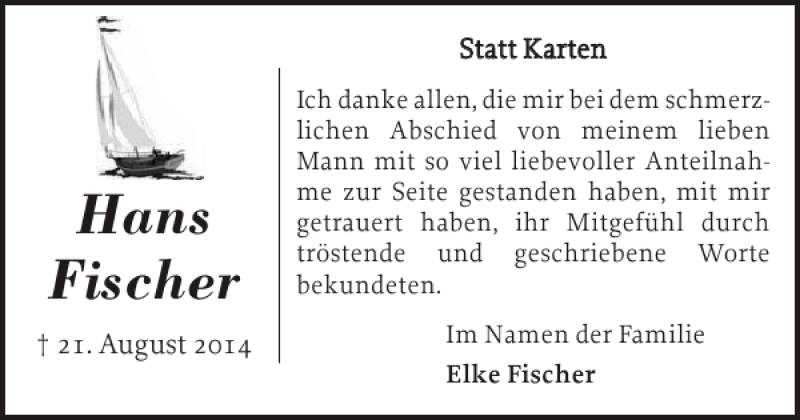 Hier finden Sie alle Traueranzeigen aus der Zeitung, die bisher für Hans Fischer erschienen sind. Weitere Traueranzeigen, die in der Zeitung erscheinen, werden hier ebenfalls aufgelistet