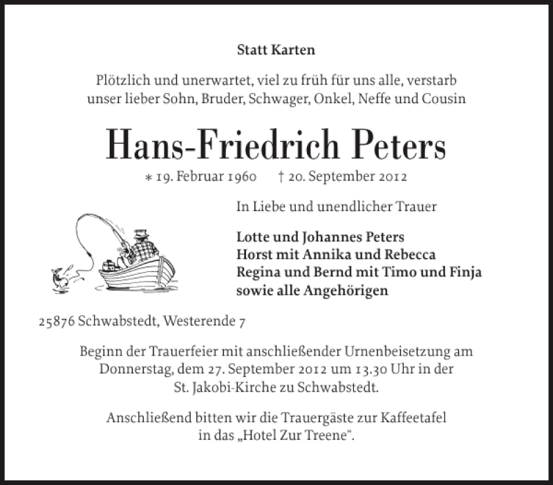 Hier finden Sie alle Traueranzeigen aus der Zeitung, die bisher für Hans-Friedrich Peters erschienen sind. Weitere Traueranzeigen, die in der Zeitung erscheinen, werden hier ebenfalls aufgelistet