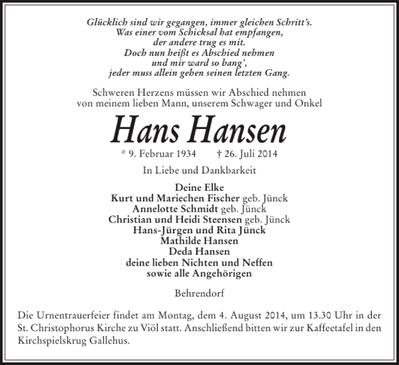Hier finden Sie alle Traueranzeigen aus der Zeitung, die bisher für Hans Hansen erschienen sind. Weitere Traueranzeigen, die in der Zeitung erscheinen, werden hier ebenfalls aufgelistet
