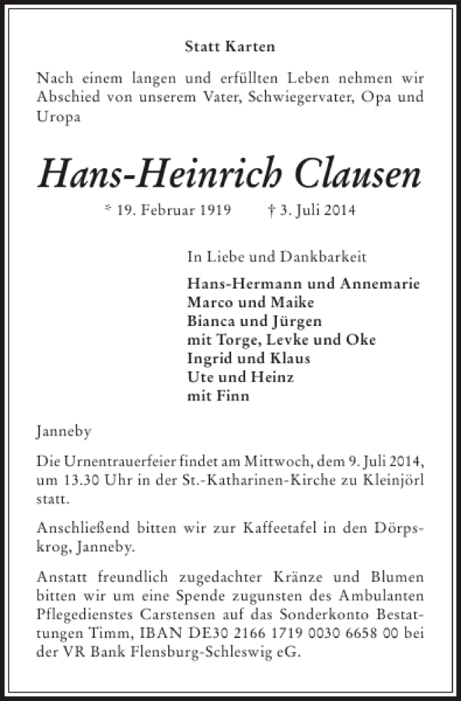Hier finden Sie alle Traueranzeigen aus der Zeitung, die bisher für Hans-Heinrich Clausen erschienen sind. Weitere Traueranzeigen, die in der Zeitung erscheinen, werden hier ebenfalls aufgelistet