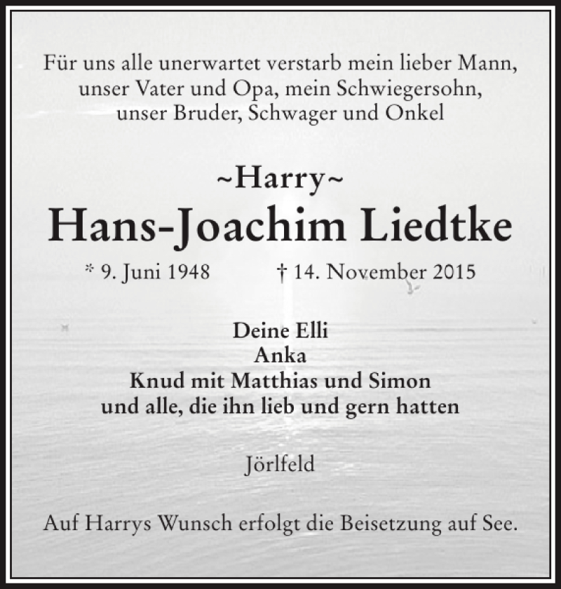 Hier finden Sie alle Traueranzeigen aus der Zeitung, die bisher für Hans-Joachim Liedtke erschienen sind. Weitere Traueranzeigen, die in der Zeitung erscheinen, werden hier ebenfalls aufgelistet