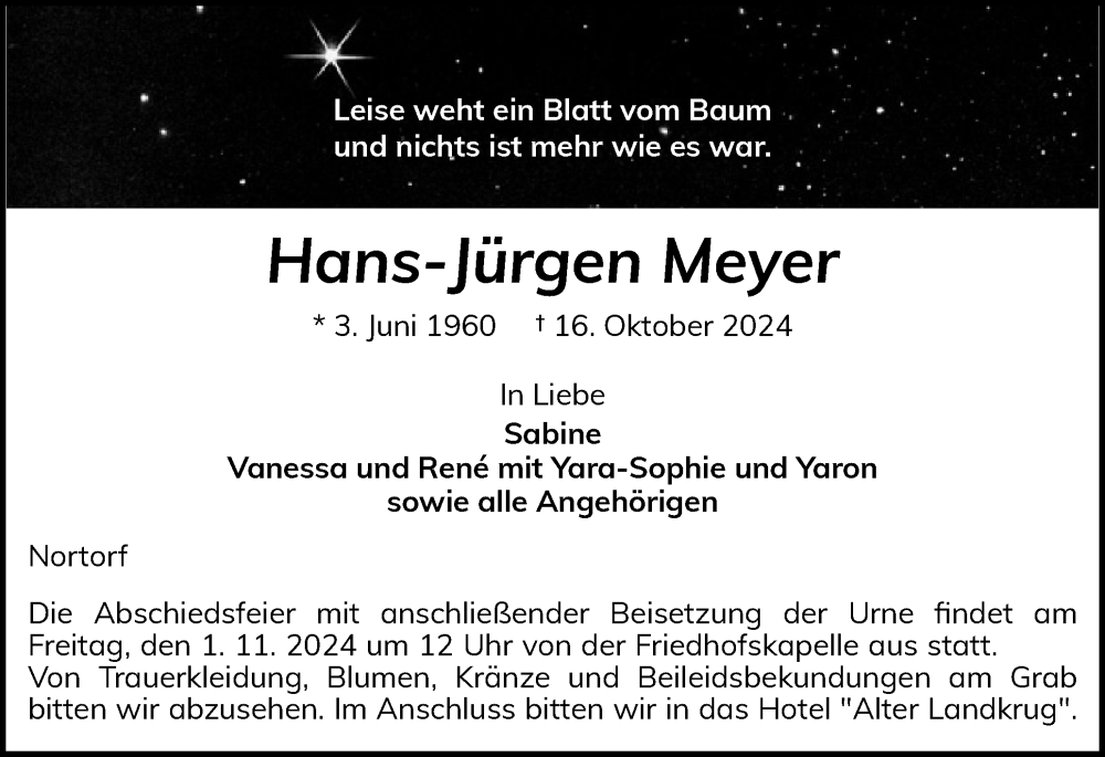 Hier finden Sie alle Traueranzeigen aus der Zeitung, die bisher für Hans-Jürgen Meyer erschienen sind. Weitere Traueranzeigen, die in der Zeitung erscheinen, werden hier ebenfalls aufgelistet