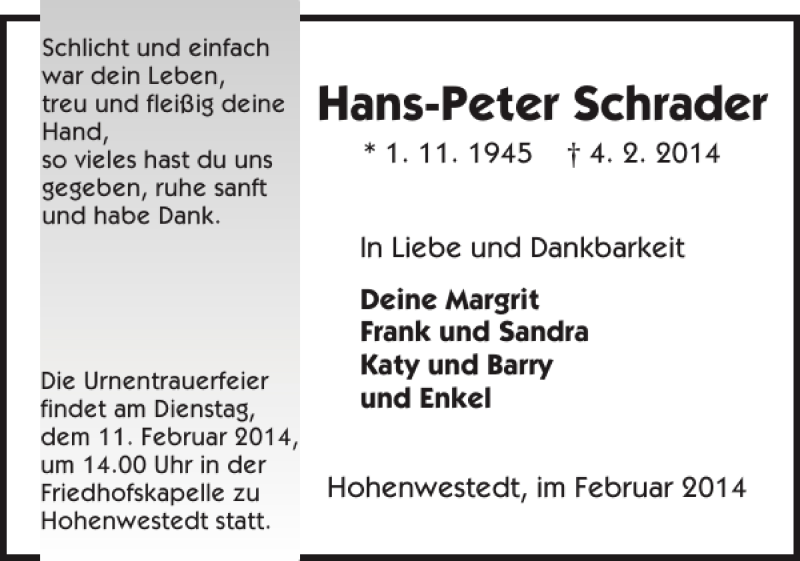Hier finden Sie alle Traueranzeigen aus der Zeitung, die bisher für Hans-Peter Schrader erschienen sind. Weitere Traueranzeigen, die in der Zeitung erscheinen, werden hier ebenfalls aufgelistet