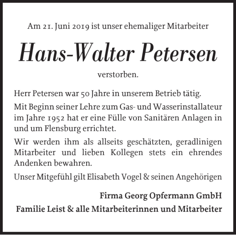 Hier finden Sie alle Traueranzeigen aus der Zeitung, die bisher für Hans-Walter Petersen erschienen sind. Weitere Traueranzeigen, die in der Zeitung erscheinen, werden hier ebenfalls aufgelistet