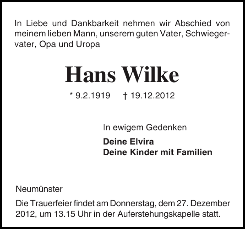 Hier finden Sie alle Traueranzeigen aus der Zeitung, die bisher für Hans Wilke erschienen sind. Weitere Traueranzeigen, die in der Zeitung erscheinen, werden hier ebenfalls aufgelistet