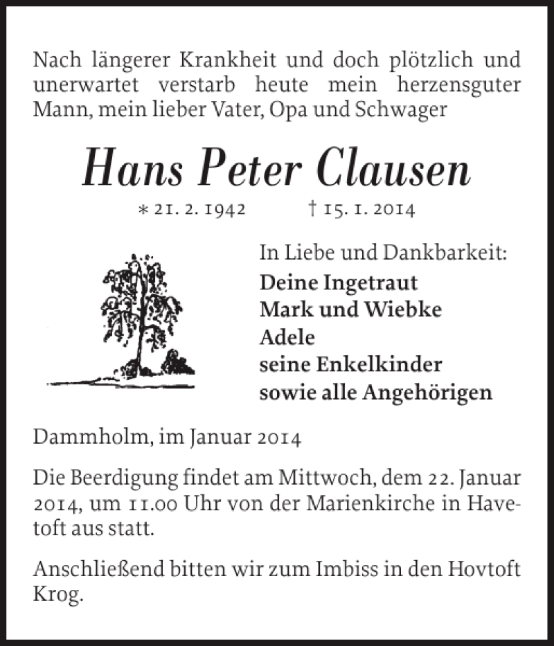 Hier finden Sie alle Traueranzeigen aus der Zeitung, die bisher für Hans Peter Clausen erschienen sind. Weitere Traueranzeigen, die in der Zeitung erscheinen, werden hier ebenfalls aufgelistet
