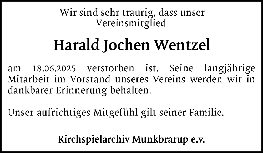 Hier finden Sie alle Traueranzeigen aus der Zeitung, die bisher für Harald Jochen Wentzel erschienen sind. Weitere Traueranzeigen, die in der Zeitung erscheinen, werden hier ebenfalls aufgelistet