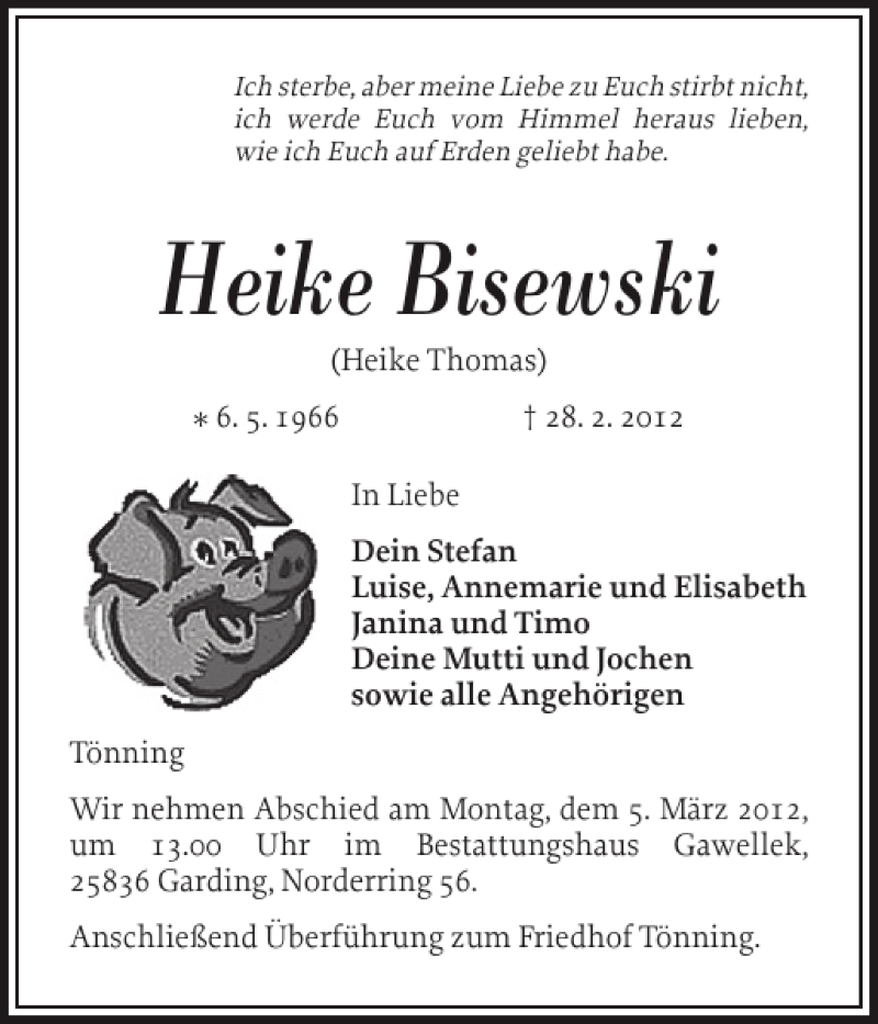 Hier finden Sie alle Traueranzeigen aus der Zeitung, die bisher für Heike Bisewski erschienen sind. Weitere Traueranzeigen, die in der Zeitung erscheinen, werden hier ebenfalls aufgelistet