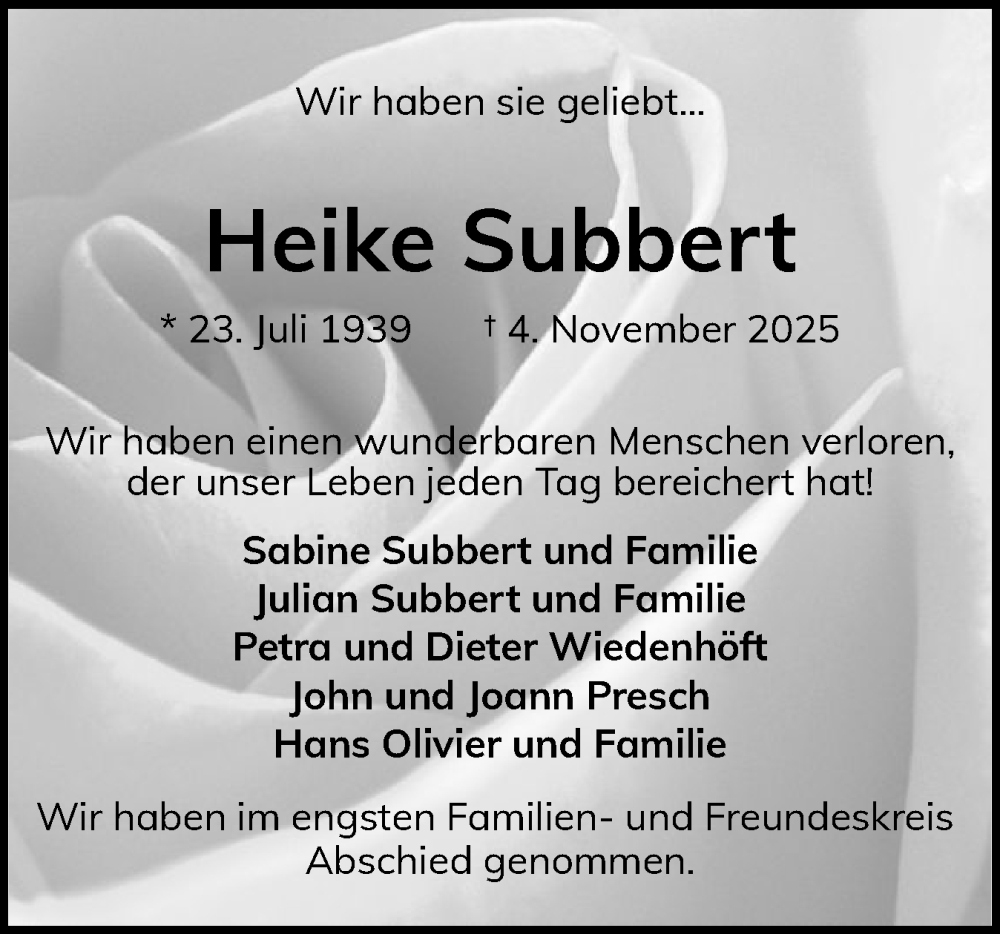 Hier finden Sie alle Traueranzeigen aus der Zeitung, die bisher für Heike Subbert erschienen sind. Weitere Traueranzeigen, die in der Zeitung erscheinen, werden hier ebenfalls aufgelistet