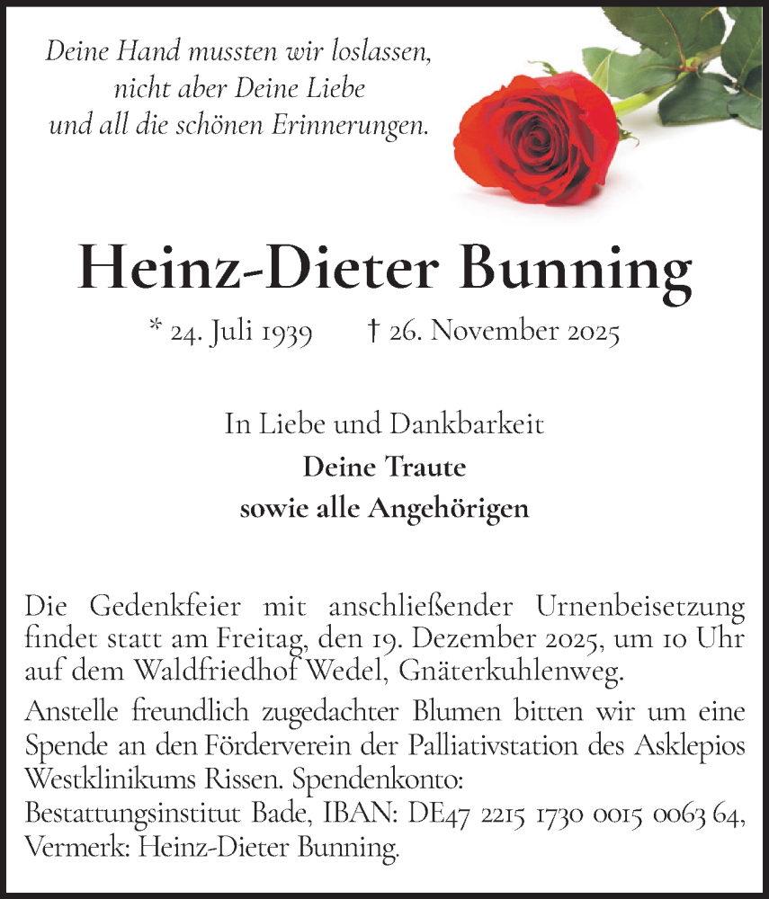 Hier finden Sie alle Traueranzeigen aus der Zeitung, die bisher für Heinz-Dieter Bunning erschienen sind. Weitere Traueranzeigen, die in der Zeitung erscheinen, werden hier ebenfalls aufgelistet