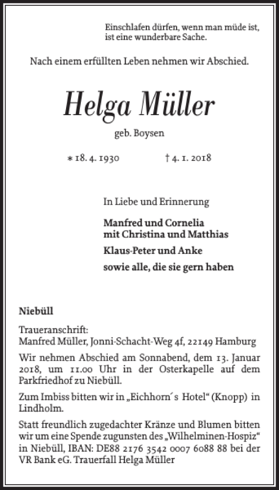 Hier finden Sie alle Traueranzeigen aus der Zeitung, die bisher für Helga Müller erschienen sind. Weitere Traueranzeigen, die in der Zeitung erscheinen, werden hier ebenfalls aufgelistet