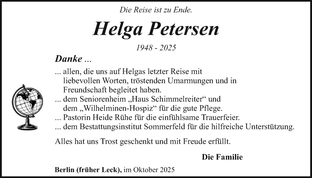 Hier finden Sie alle Traueranzeigen aus der Zeitung, die bisher für Helga Petersen erschienen sind. Weitere Traueranzeigen, die in der Zeitung erscheinen, werden hier ebenfalls aufgelistet