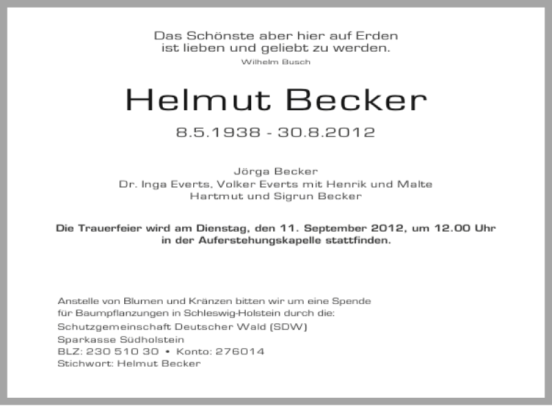 Hier finden Sie alle Traueranzeigen aus der Zeitung, die bisher für Helmut Becker erschienen sind. Weitere Traueranzeigen, die in der Zeitung erscheinen, werden hier ebenfalls aufgelistet