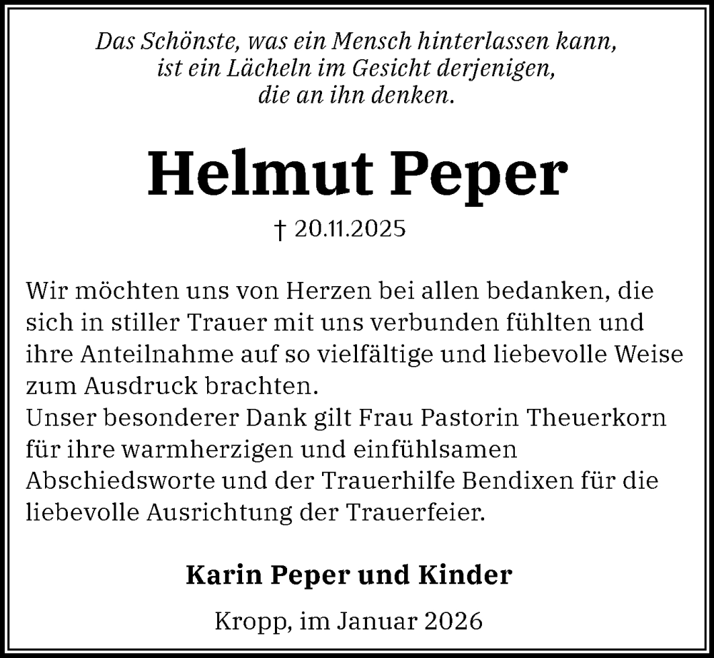 Hier finden Sie alle Traueranzeigen aus der Zeitung, die bisher für Helmut Peper erschienen sind. Weitere Traueranzeigen, die in der Zeitung erscheinen, werden hier ebenfalls aufgelistet